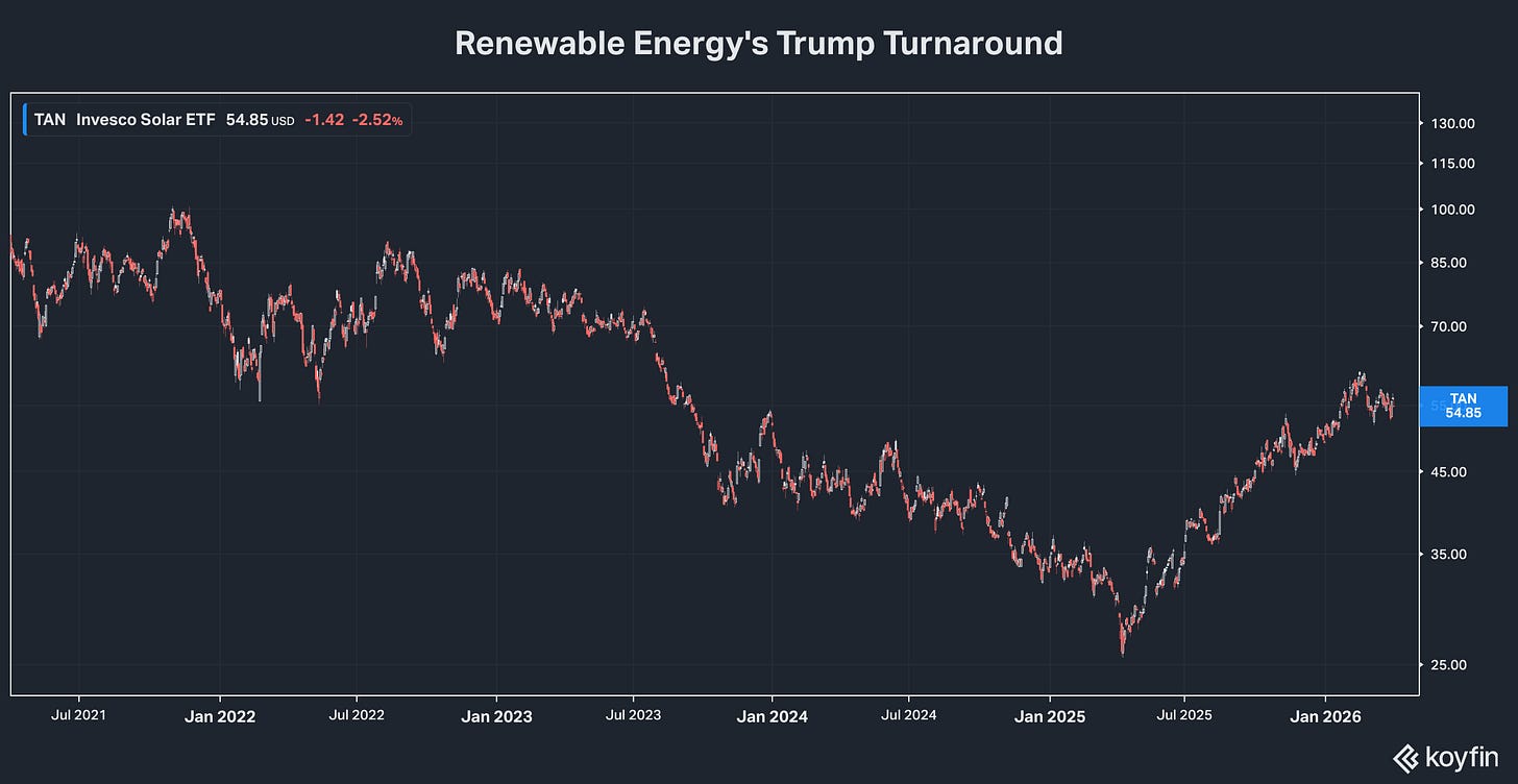 Mainly, since Inauguation Day 2025, renewable energy stocks have been among the stock market’s best performers, reversing a crushing four-year bear market under the previous president.