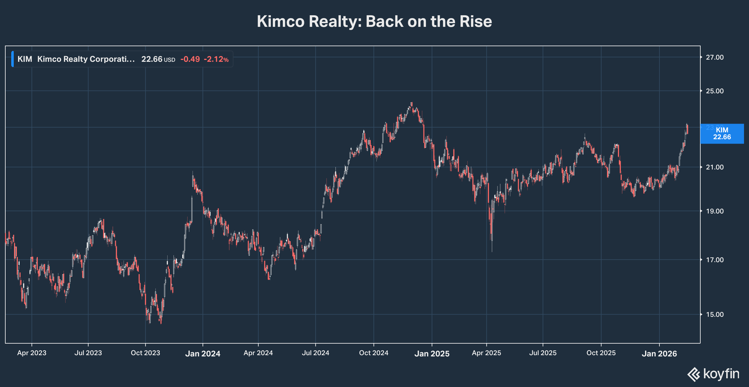 Retail REITs have started out 2026 better than they finished 2025. Shares of grocery anchored shopping mall owner Kimco Realty (NYSE: KIM), for example, are already up by a double-digit percentage this year, after losing almost -10 percent in 2025. NNN (NYSE: NNN) is also up double-digits after being underwater before dividends last year.