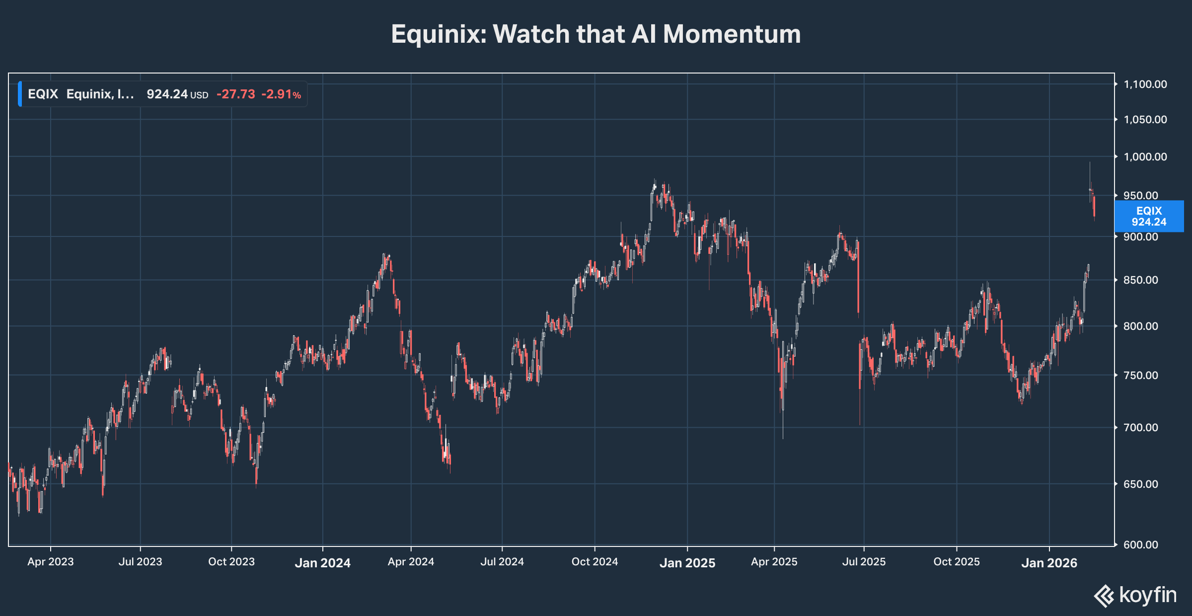 I still think the best in class of these sectors have a lot more left in the tank over the long-term. But a look at the recent price history of Equinix highlights some major declines in relatively short periods of time. And the $200 per share gain since early December may not last long.