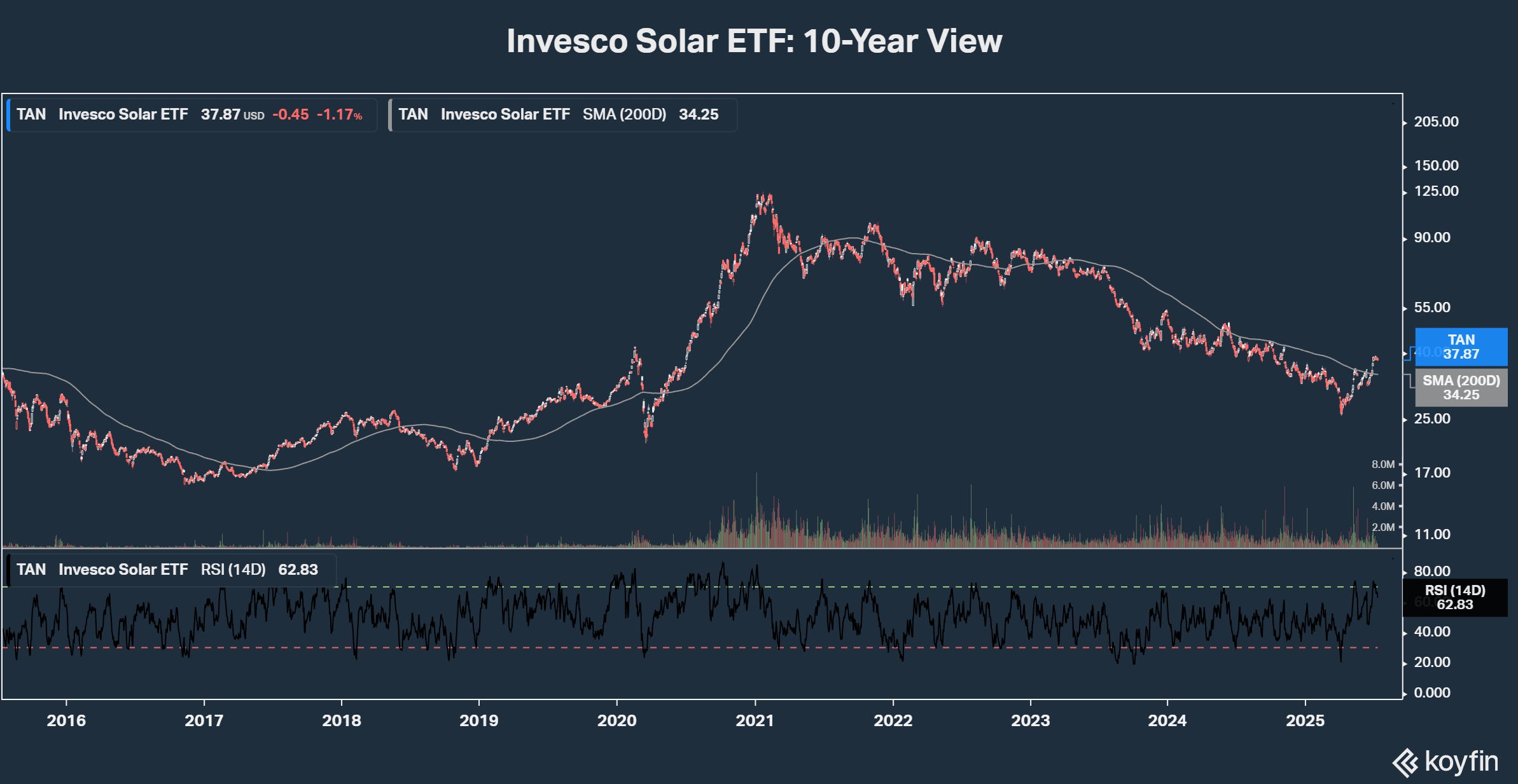 And one more thing: TAN closed January 20, 2021—Biden’s Inauguration Day—at 114.78. On January 17, 2025, the trading day before Trump took office, the ETF finished at just 34.39.