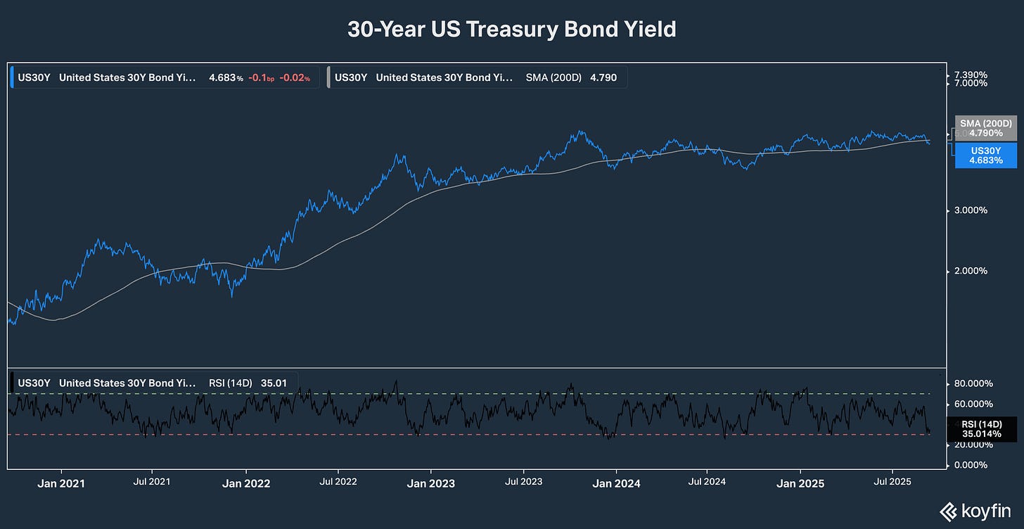 This graph shows the yield on 30-year US government Treasury bonds for the past five years. This is the rate companies' longest-term bonds are priced against by investors.